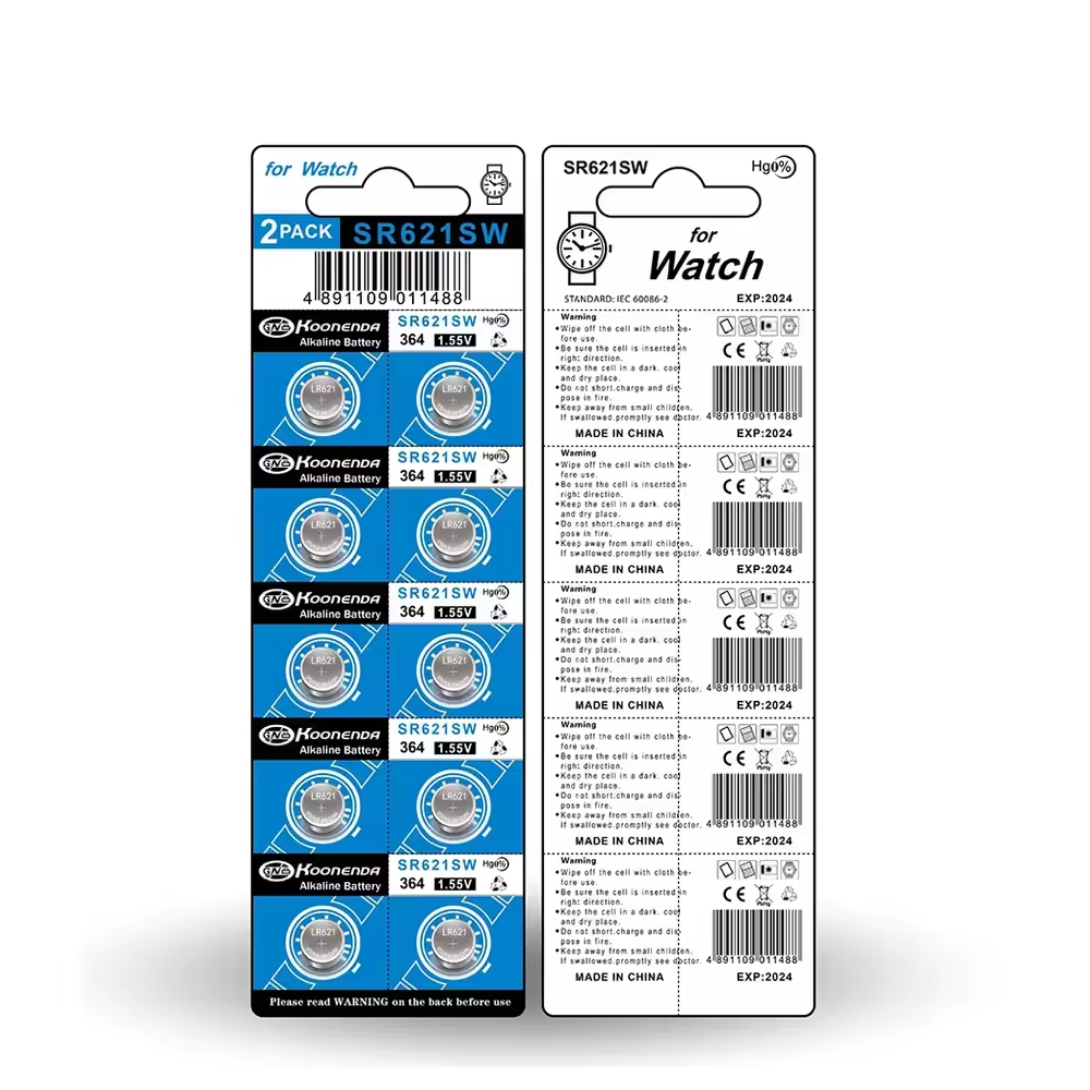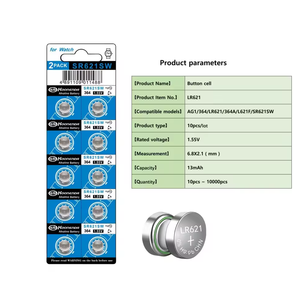 Blister de 10 pilas botón AG1 LR621 de 1.55V marca Koonenda, especialmente diseñadas para dispositivos electrónicos de pequeño tamaño que requieren un suministro energético estable y prolongado.