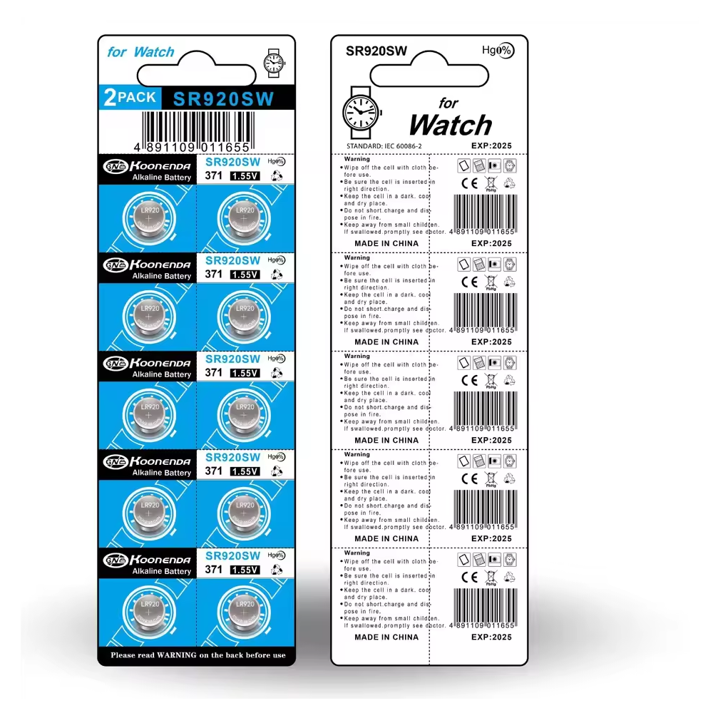 Blister con 10 pilas botón AG6 de 1.55V de la marca Koonenda, diseñadas para alimentar dispositivos electrónicos que requieren precisión, continuidad y un formato compacto. Este modelo es compatible con otras referencias habituales como LR920, 371 y SR920. Por tanto, es ideal como reemplazo en una gran variedad de aparatos.