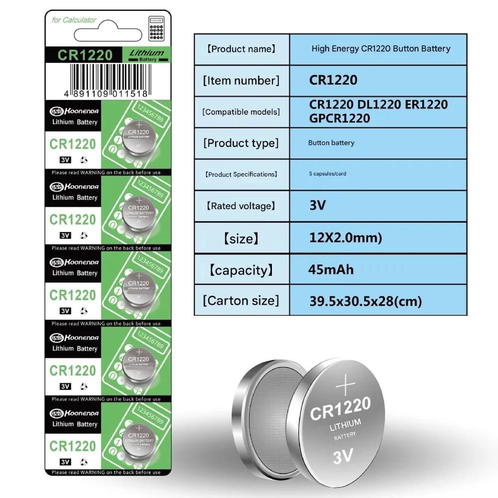 La pila CR1220 Koonenda combina un formato ultracompacto de 12 × 2 mm con la estabilidad del litio, ofreciendo un voltaje constante de 3 V. Este diseño la hace perfecta para relojes de pulsera, mandos a distancia y pequeños sensores electrónicos.
