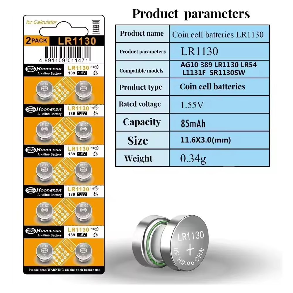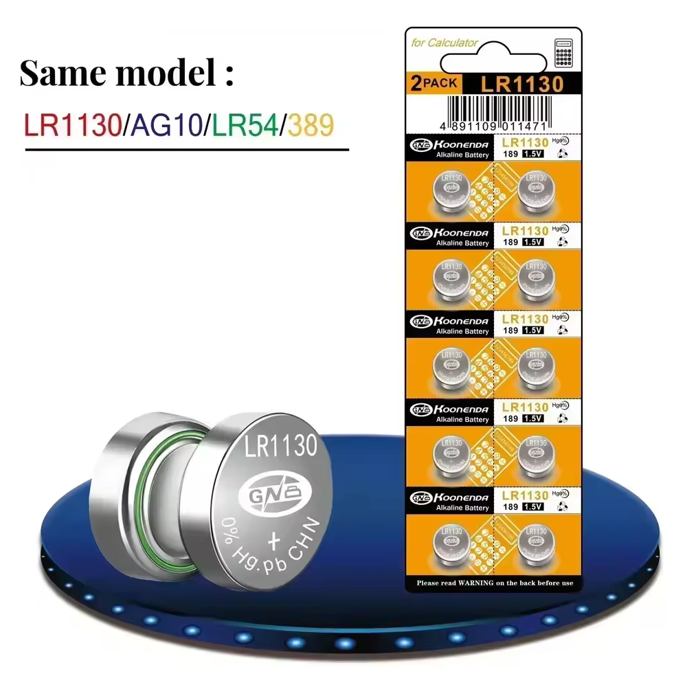 Lote compuesto por 10 pilas botón AG10 de 1.5V de la marca Koonenda, compatibles con una gran variedad de referencias estándar como LR54, LR1130, SR1130SW, 389, 390, GP189, G10, KA54, V10GA, entre otras. Esta alta compatibilidad convierte este modelo en una opción ideal para sustituir pilas agotadas en numerosos dispositivos.