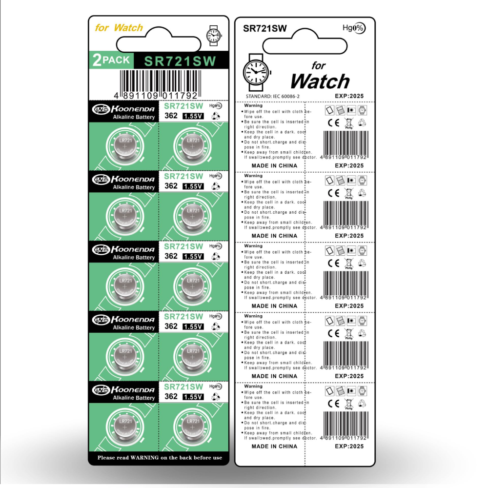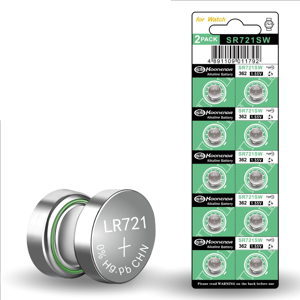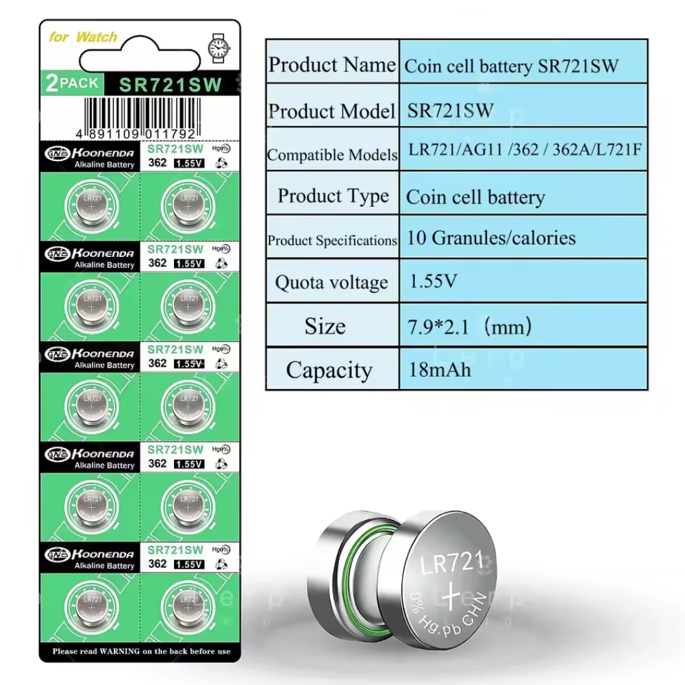Blister con 10 pilas botón AG11 de 1.55V de la marca Koonenda. Este modelo es compatible con múltiples referencias estándar del mercado, incluyendo 361, 362, SR721SW, SR720, LR721, V362, GP62, D361 y otras equivalencias como SR58, RW310, SB-AK/DK, SP362, TR721 o 280-29. Esta alta compatibilidad convierte a la AG11 en una opción universal y versátil.