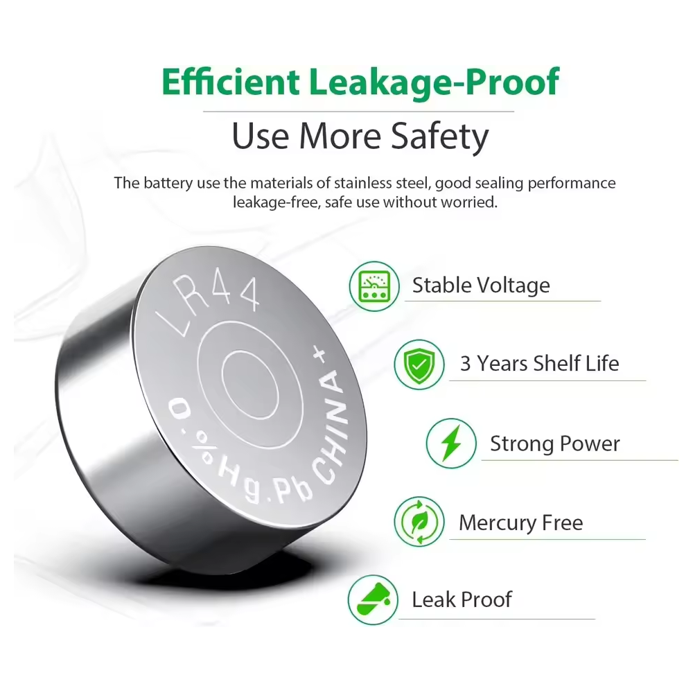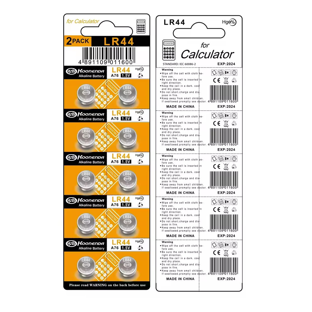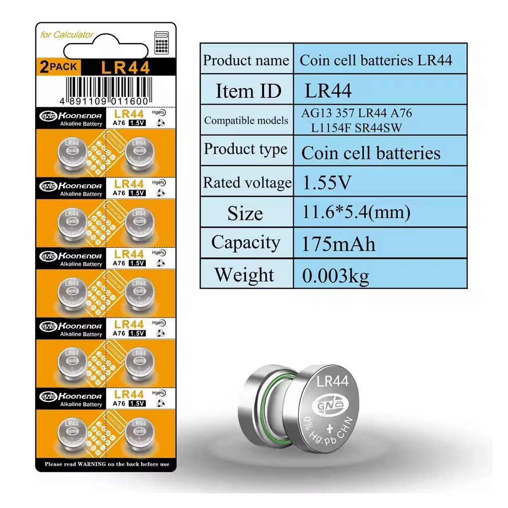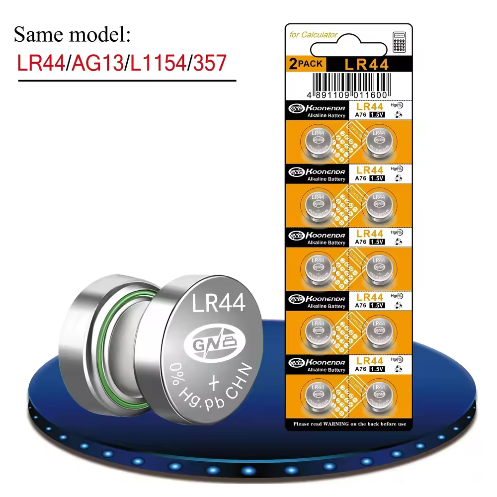 Lote de 10 pilas botón AG13 de 1.5V marca Koonenda, también conocidas como LR44, LR1154 o A76. Este modelo cuenta con una amplia compatibilidad con referencias estándar como G13A, V13GA, PX76A, 357, SR44, GPA76, GP357, S76, RW82, SB-B9, entre otras. Por tanto, resulta ideal como reemplazo universal en múltiples dispositivos electrónicos.