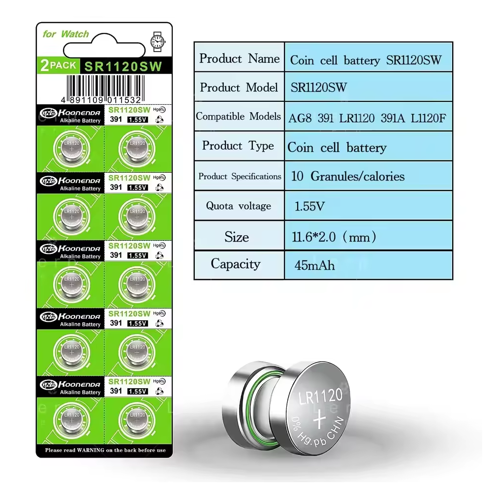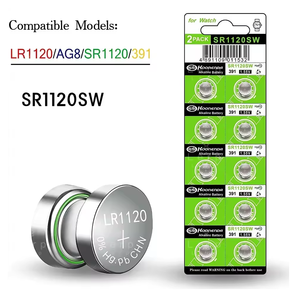 Blister con 10 pilas botón AG8 de 1.55V marca Koonenda, compatibles con múltiples referencias internacionales como LR55, 391, SR1120SW, 191 y LR1120. Esta compatibilidad permite utilizar estas pilas como recambio en una gran variedad de dispositivos electrónicos de pequeño tamaño.